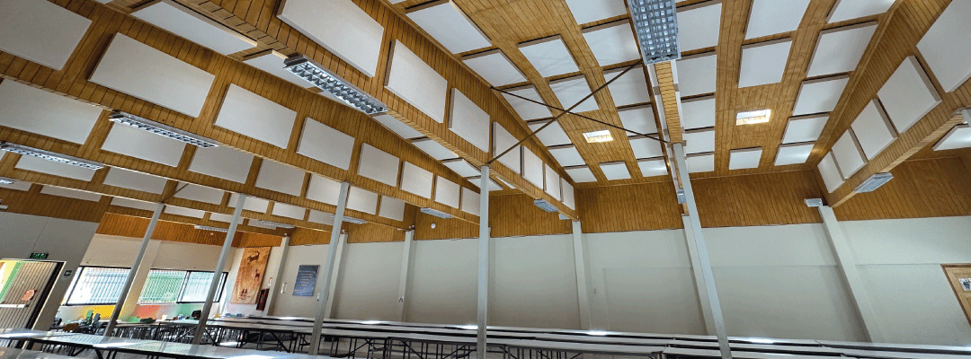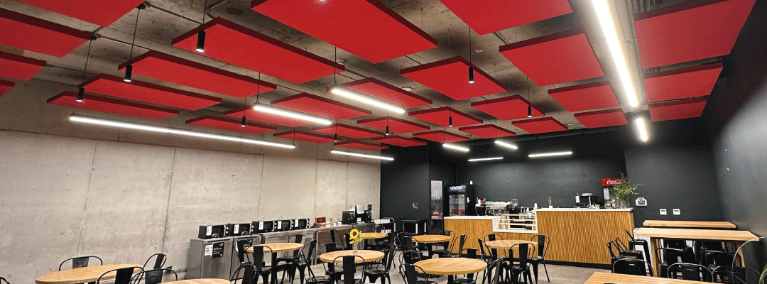 Los paneles acústicos flotantes o baffles acústicos son una solución efectiva para reducir la reverberación en espacios multifuncionales. Estos paneles se instalan en el techo, proporcionando una mejora significativa en el ambiente acústico al promover el uso de materiales absorbentes.